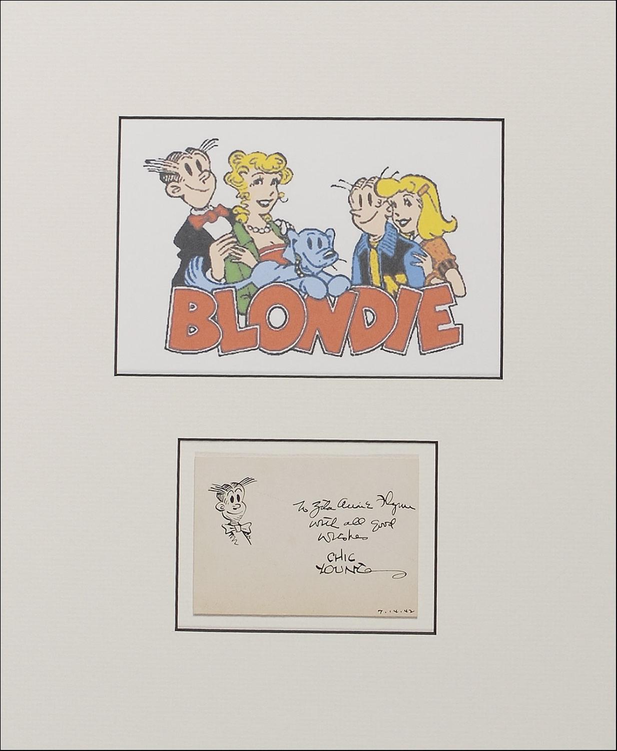 Original vintage signed and inscribed ink sketch of Dagwood Bumstead on an off-white 3.5 x 2.5 card. Removably affixed to a mount, and matted with a color image of his characters, to an overall size of 10 x 12. In fine condition, with some mild edge toning, and a light spot to center.