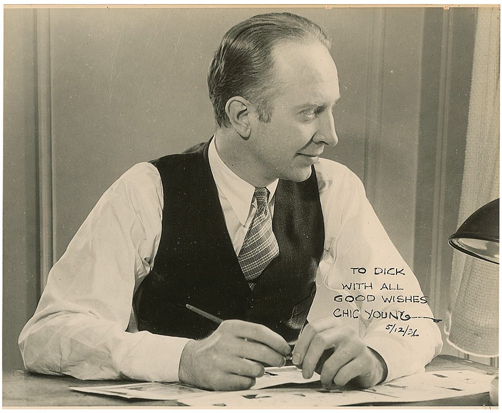 Vintage glossy 9.5 x 7.75 photo of Young at his desk, signed and inscribed in fountain pen “To Dick with all good wishes Chic Young 5/12/36.” Lightly trimmed edges, tack hole to lower right, some scattered light creases and surface marks, and a couple trivial spots of surface loss along top, otherwise fine condition.