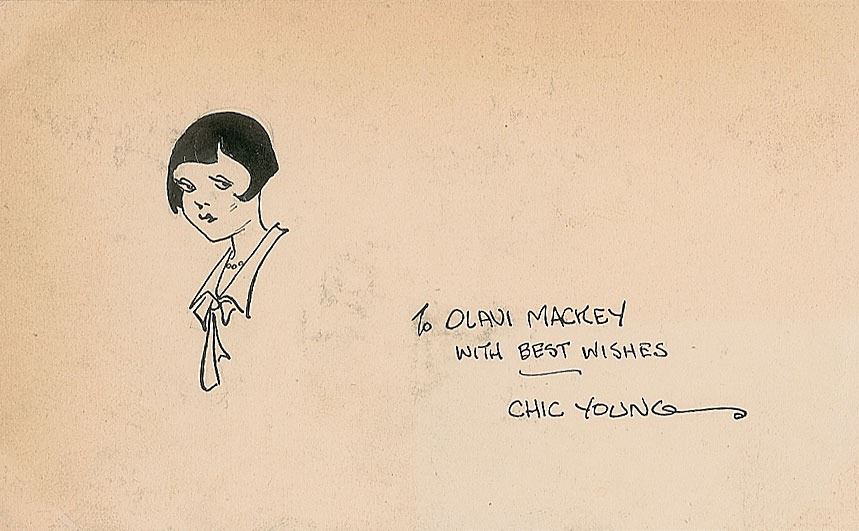 American cartoonist (1901–1973) who created the hugely popular comic strip Blondie. Original vintage sketch of an attractive flapper girl with short dark hair by Chic Young, accomplished on an off-white 5.25 x 3.25 card, which is signed and inscribed, "To Olavi Mackey, with best wishes, Chic Young." In fine condition, with some light toning.