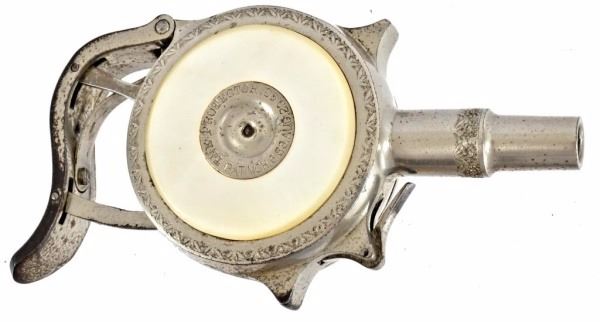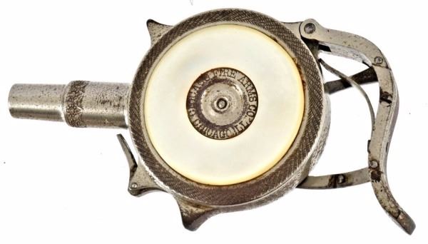 Antique in good working condition. retains most original nickel finish with mother of pearl insert.