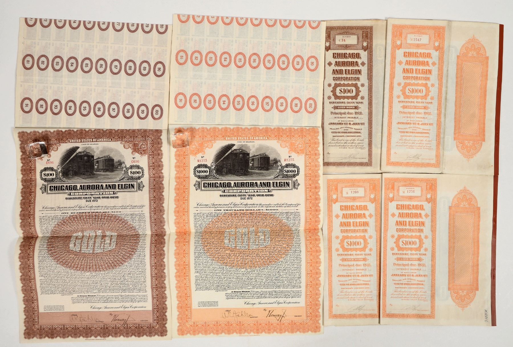 Lot of 6. I/U. Issued 1922. EF cond. Chicago Aurora And Elgin Corp. , $1000, 6%, gold bearer bonds, coupons attached. Two Varieties. Franklin-Lee BNC printer.