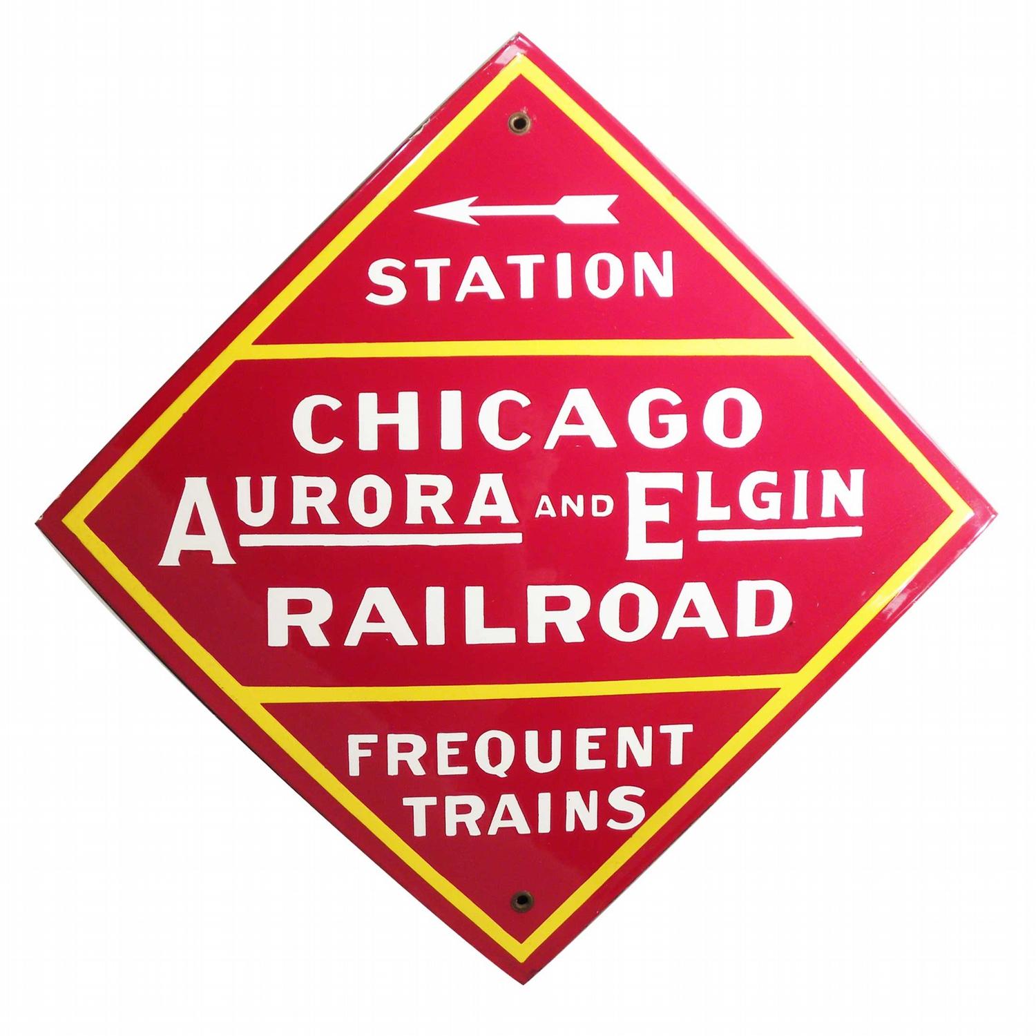 Chicago Aurora and Elgin Railroad Station Porcelain Sign. Tiny chip at 11:00 otherwise excellent condition. 34 inches tip to tip.