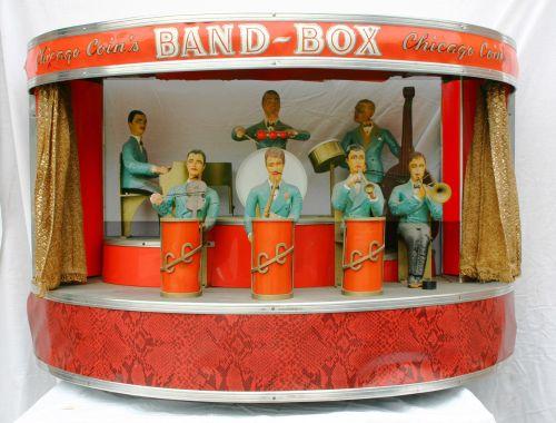 The purpose of the Chicago Coin’s Band Box is to serve as a speaker for a connected jukebox. Upon the insertion of a coin, the curtains open and the band starts to play with each figure playing a different instrument. A very desirable and sought after piece, especially if found in original condition. We have not tested this one for functionality.