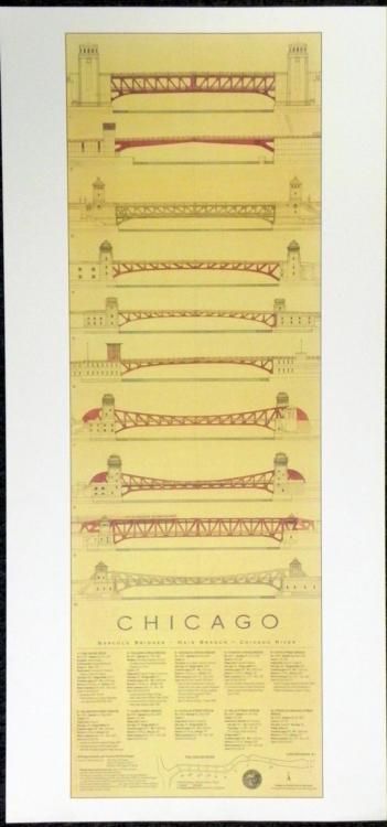 10 of Chicago's drawbridges are presented in fine detail in this vintage style architectural print. Title: Chicago Bascule Bridges Main Branch Chicago River Medium: Lithograph on paperSheet size: 17 x 36 inchesCondition: Excellent