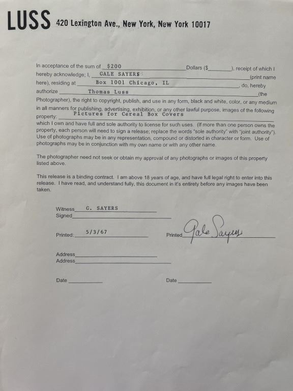 Gayle Sayers signed cereal box covers contract. 9x12 inches. DB607