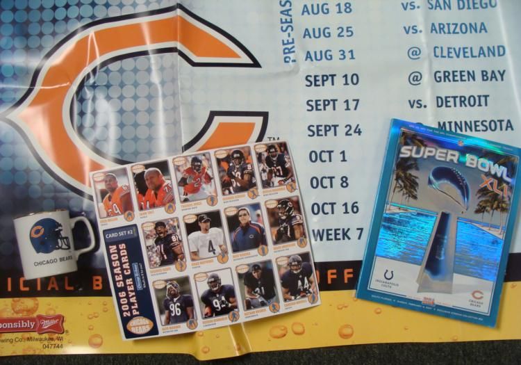Once Jay Cutler went down with his injured thumb, it seemed to have a domino effect on the rest the team. Not only have they not won a game since his injury, but other key players on the team were plagued with injuries as well. So this season is a wash, however have some faith for a better season next year. Hopefully this lot will cheer you up. Offered here is a Chicago Bears Super Bowl lot. In this lot you will receive: * 35" x 116" 2006 MGD Chicago Bears ScheduleXL, 2006 NFC Champion navy blue sweaterSuper Bowl XLI program1985 Super Bowl Chicago Bears Mug1985 Chicago Bears World Champions Bumper StickerChicago Tribune 2006 Season Player Cards, Set #2All the items are in excellent condition. This lot is perfect addition to any Chicago Bears collection. * *