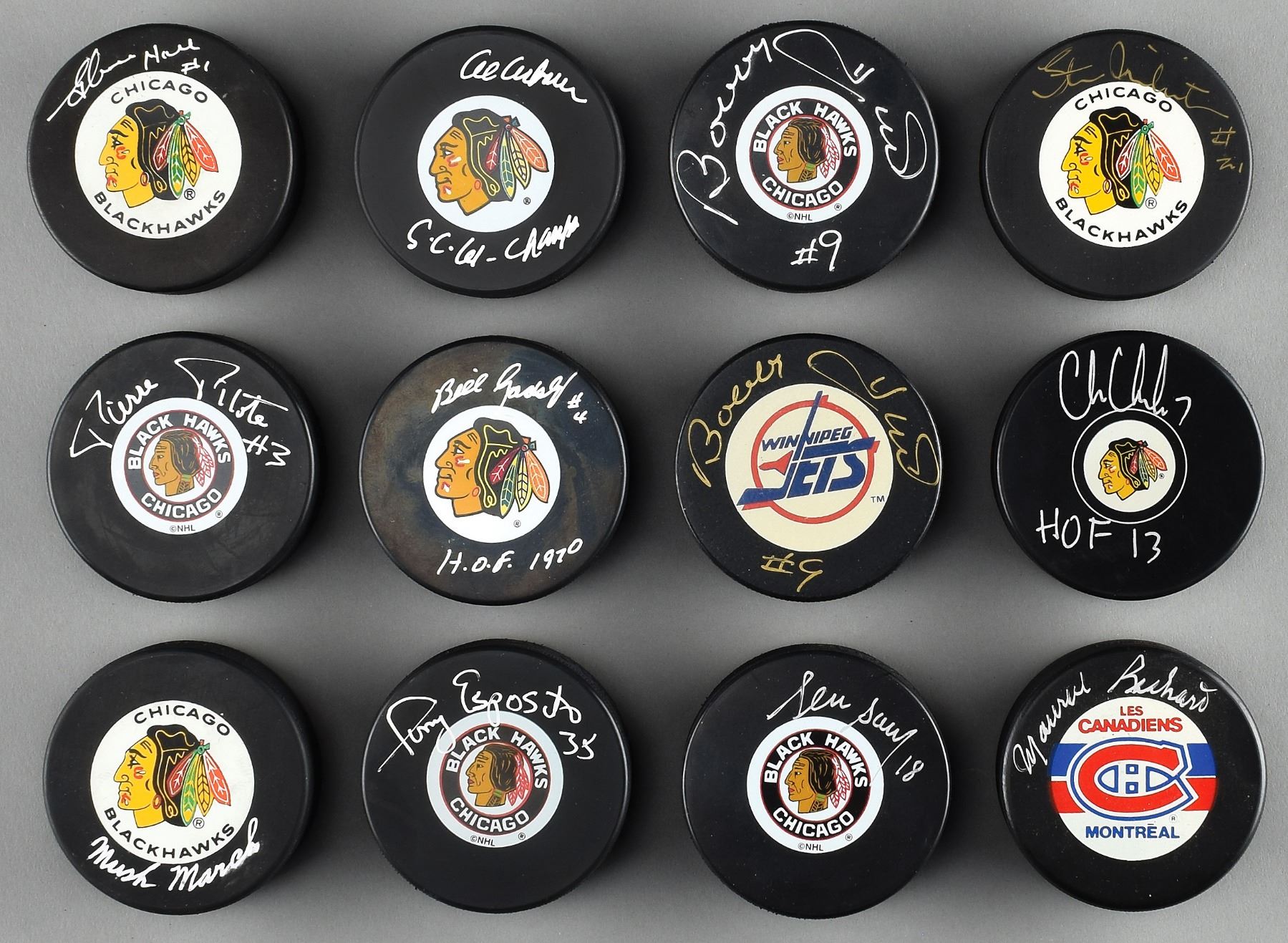 Many of the greatest names in Chicago Black Hawks hockey history are included in this signed puck collection of 10, mostly HOFers. Notations in the player’s hand, such as jersey number or HOF induction year, are on many of the Black Hawks emblazoned pucks. Includes: HOFers - Al Arbour (Dec.), Chris Chelios, Tony Esposito, Bill Gadsby (Dec.), Glenn Hall, Bobby Hull – Black Hawks, Stan Mikita (Dec.), Pierre Pilote (Dec.). Others – Mush March (1930s Blackhawks - Dec.) and Steve Smith.