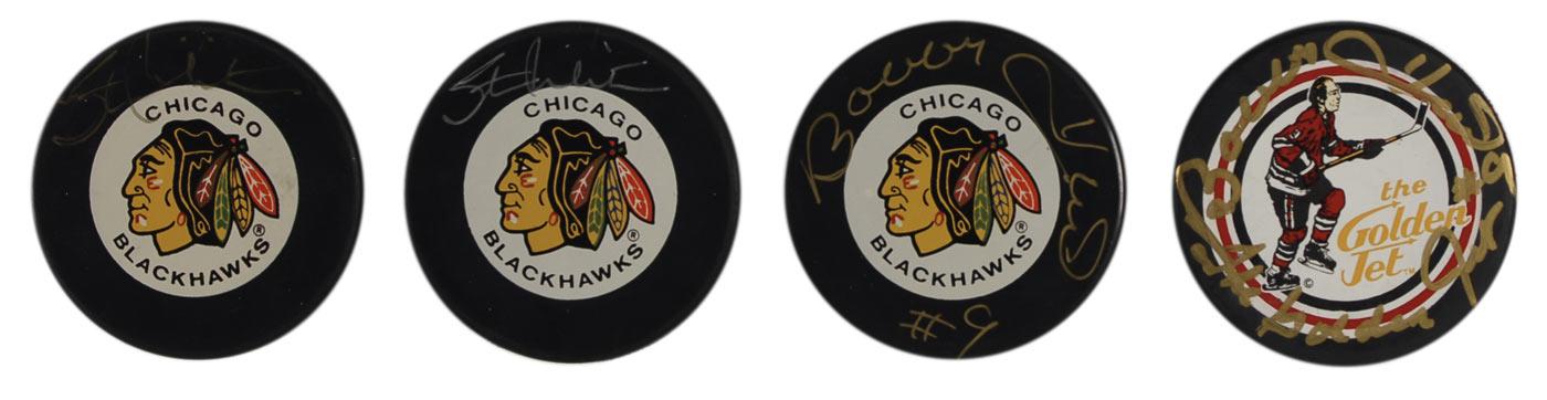 Four items: three official NHL Chicago Blackhawks hockey pucks, individually signed in silver or gold ink on the logo side by Stan Mikita (2) or Bobby Hull (adding “#9”); and a Hull commemorative puck signed in gold ink, “Bobby Hull, #9, The Golden Jet” on the logo side. In overall fine to very fine condition.