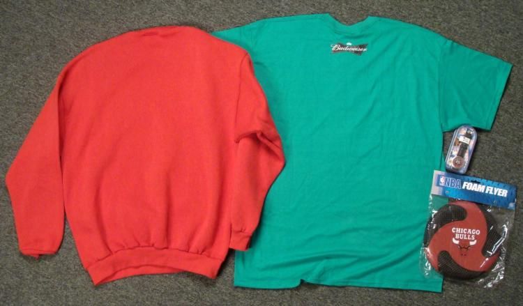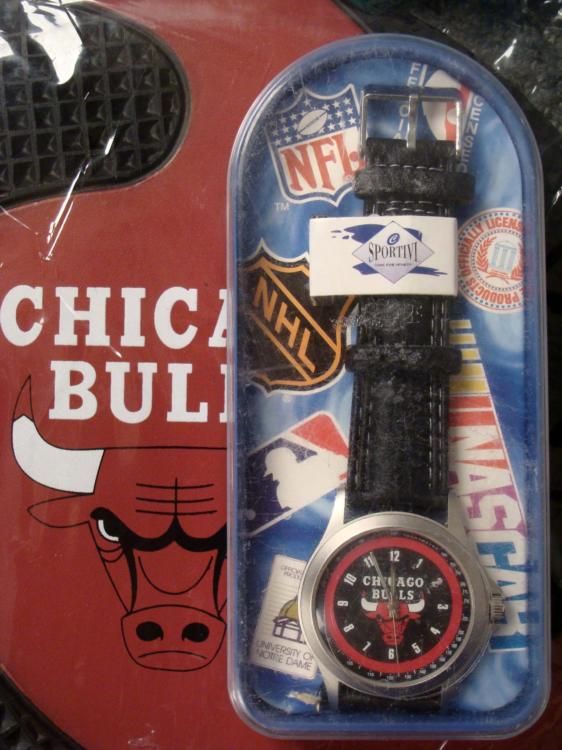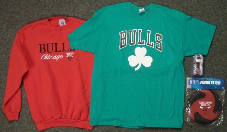 Even though the NBA is in lock-out mode, still shouldn't deter you from bidding on this great lot. In this lot you will receive:XL St. Patrick's Day Bulls T-shirt Chicago Bulls NBA Foam Flyer Large Bulls Sweater Sportivi Chicago Bulls WatchThere conditions range from very good to near mint. The watch comes in it's new case and will need new batteries. The Chicago Bulls were a step away from the promise land and if next year actually happens, you can put these items into your collection, or wear them while you're watching the new generation of the Chicago Bulls!