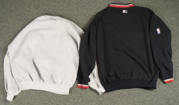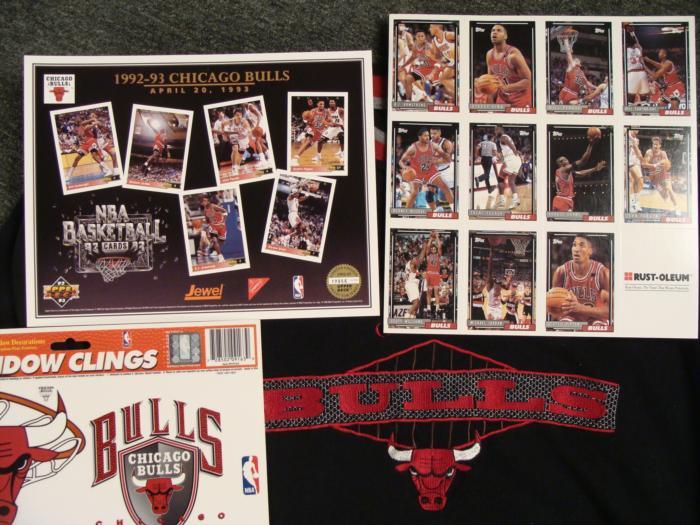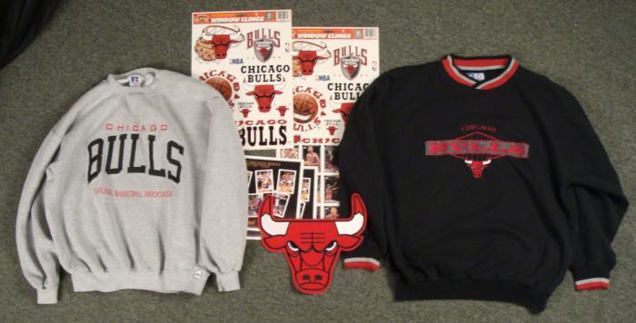 Here is a great selection of Chicago Bulls collectibles from the Jordan era. The wearables are pre-worn, but overall everything is in very good condition. * Russell gray sweatshirt with embroidered letters, size large Starter black sweatshirt with embroidered logos, and elastic knit, size large 2 limited edition 8 x 10 photos from Upper Deck, 1993 Uncut card sheet from Topps, Rust-Oleum 12 inch logo patch 2 window clings sheets, 12 x 17 inches * * These are excellent for any Bulls collection.