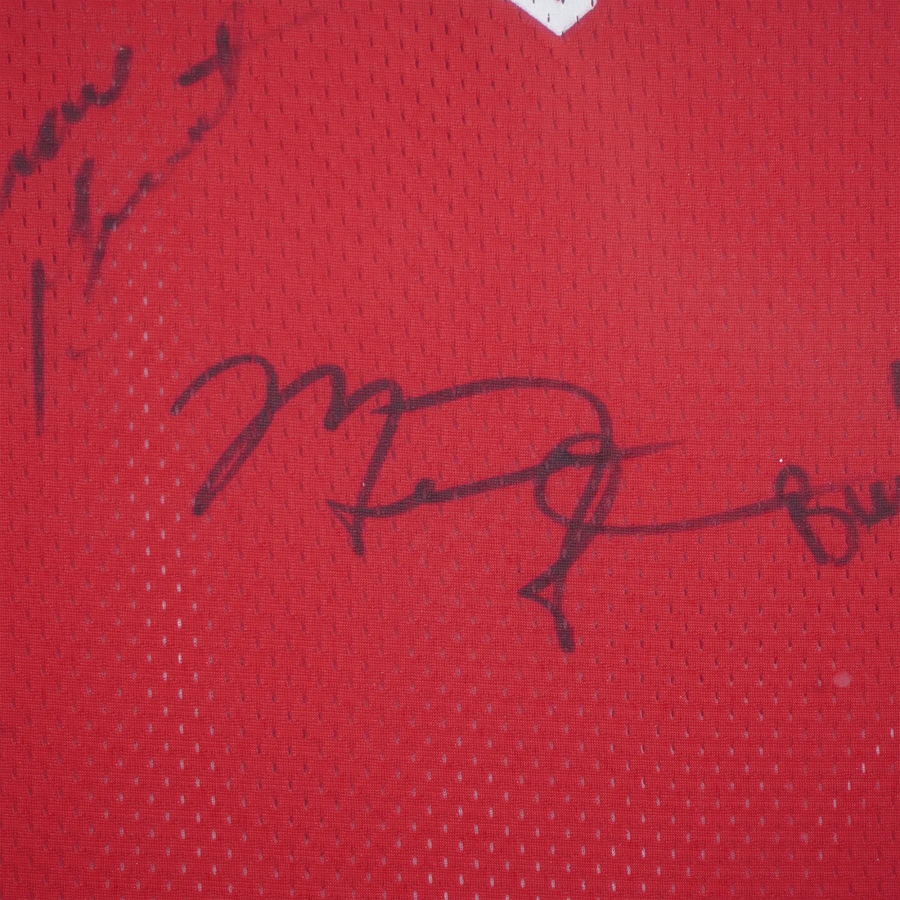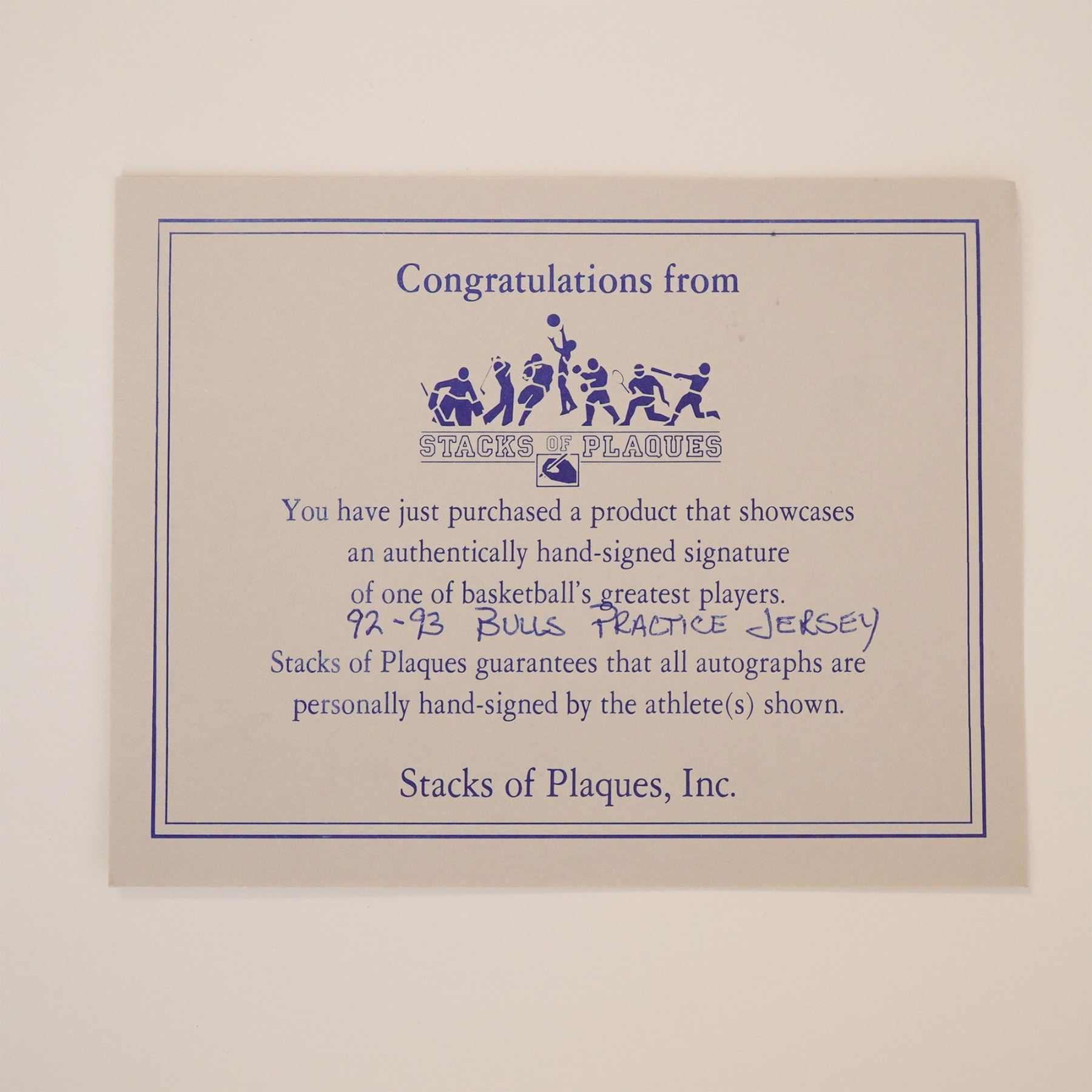 This Chicago Bulls jersey is hand-signed by multiple legendary players, including Michael Jordan, Scottie Pippen, Horace Grant, and John Paxson. The jersey features the classic red Bulls design with bold black and white lettering, and the signatures are prominently displayed across the front. Encased in a custom frame with a double mat, this piece is a stunning tribute to one of the NBA's most iconic teams. A must-have collectible for basketball enthusiasts, Bulls fans, and sports memorabilia collectors. COA from Stacks of Plaques, Inc.