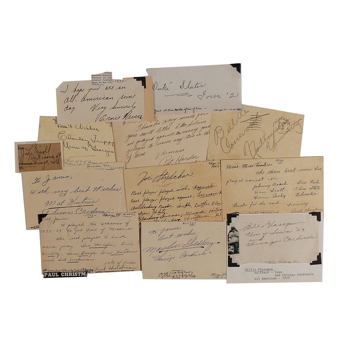 Eleven items consisting of vintage ink and pencil signatures on various size cards and slips and letters, each signed by a different member of the Chicago Cardinals. Signers include: Pat Harder, Charley Trippi, Marshall Goldberg, Paul Christman (2), Ernie Nevers, Bill Glassgow, Duke Slater, Joe Stydahar, Mal Kutner, and J. L. Driscoll. In very good condition, with various scattered toning, trimmed edges, folds, and mounting remnants to some of the corners.