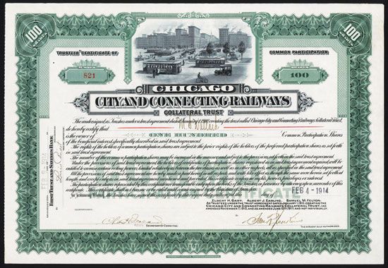 Ohio, 1914, 100 Shares, Issued and Uncancelled Stock, #821, Black on green border and underprint, Busy downtown Chicago with moving trolleys, VF-XF condition, Western BNC. Color and denomination not listed in Cox Catalogue.