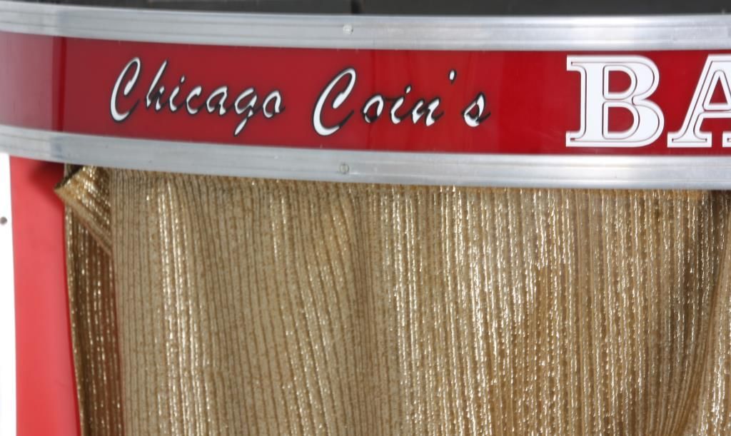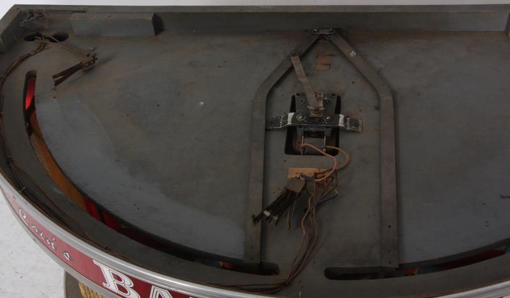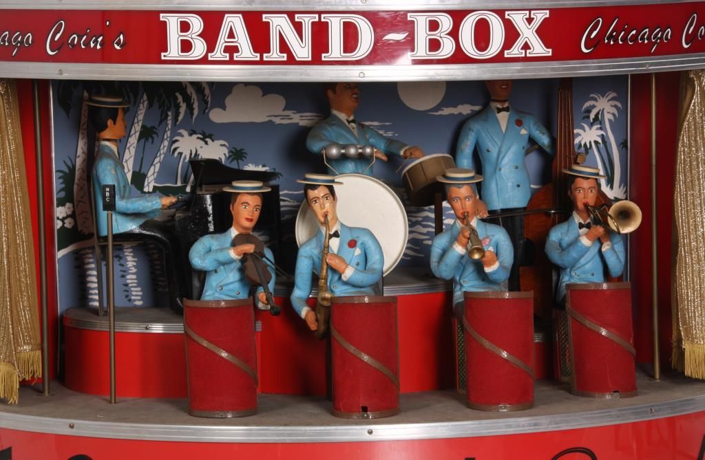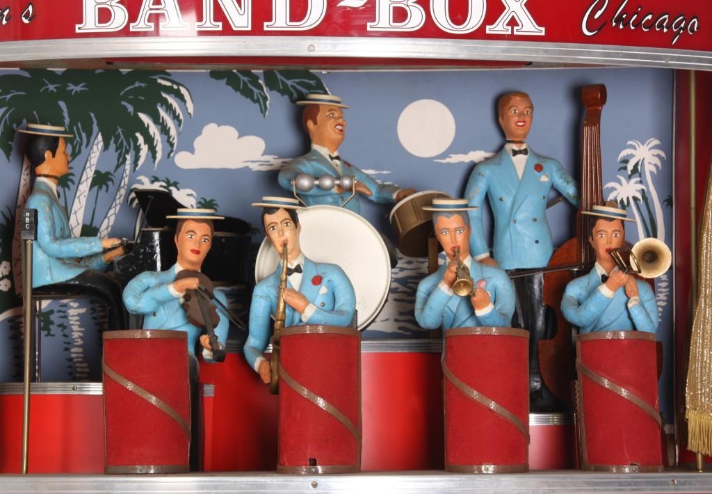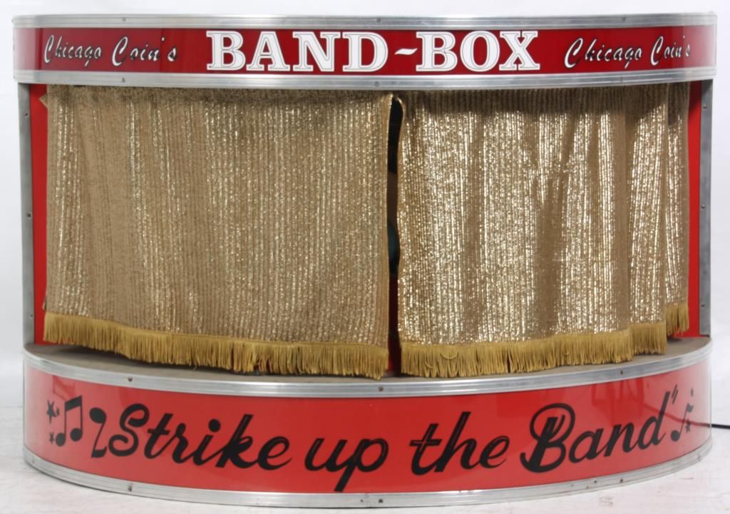Chicago Coin’s Band Box Juke Box Orchestra Speaker Deluxe Model 1951. The box resembles a curved front stage with glimmering curtain, when the jukebox is turned on to play, the curtain opens and the animated band begins to play; the figures are formed in a soft foam with painted suits and faces, there is a piano player, drummer, upright bass player, violinist & 3 pc. brass horn section, the figures bounce up and down or rock back and forth to imitate the playing motions. The front row figures each has a light-up podium in front of them and the scene has a tropical moonlit background. has nickel silver trim with reverse lighting behind 2 curved red plastic panels, the top reads “Chicago Coin’s, Band~Box”, the lower banner reads “Strike Up The Band”. In good working condition. Signed on a metal tag on the back, Band Box, Model 50-100 and serial number 2203. 29 in. high x 46 in. wide x 23.5 in. deep.