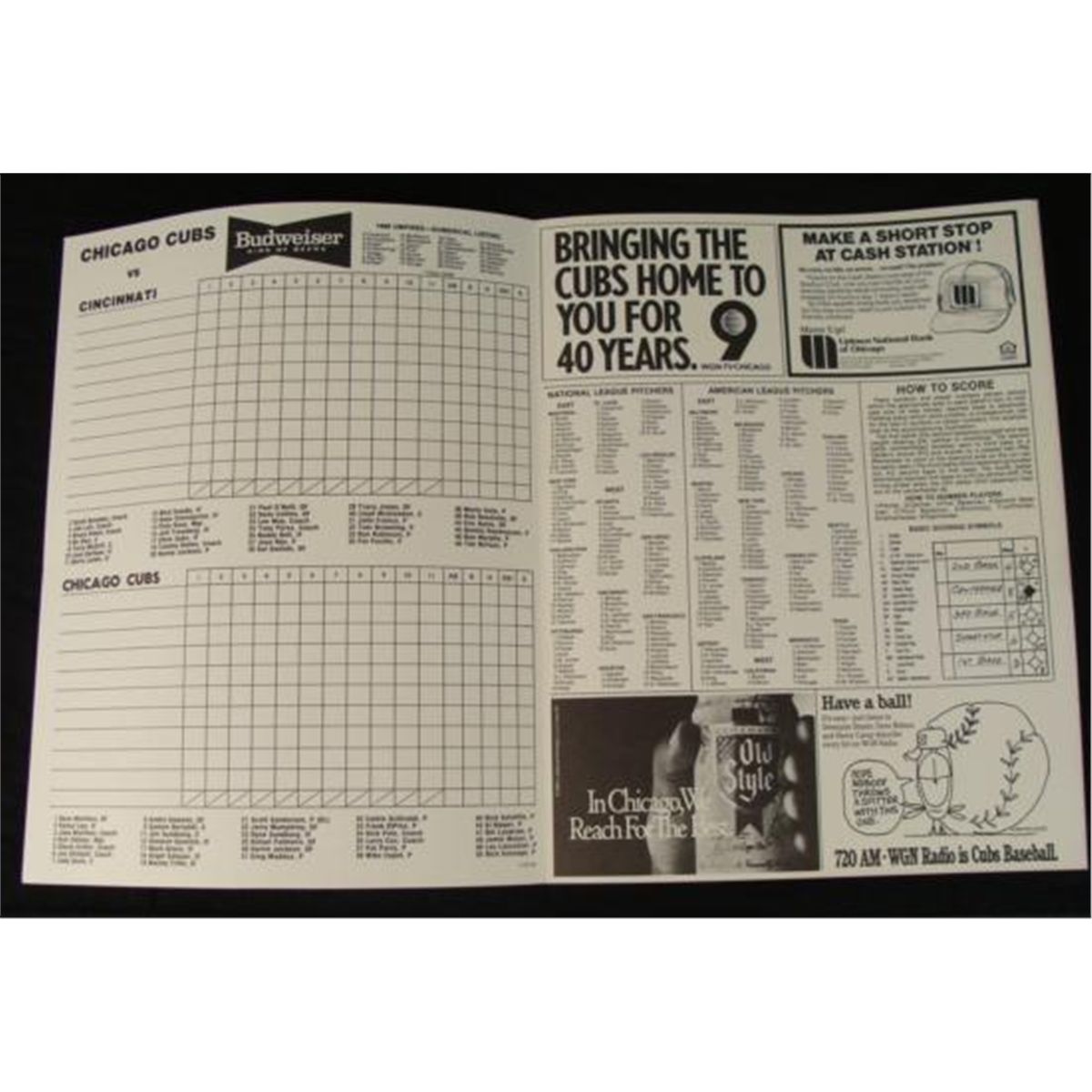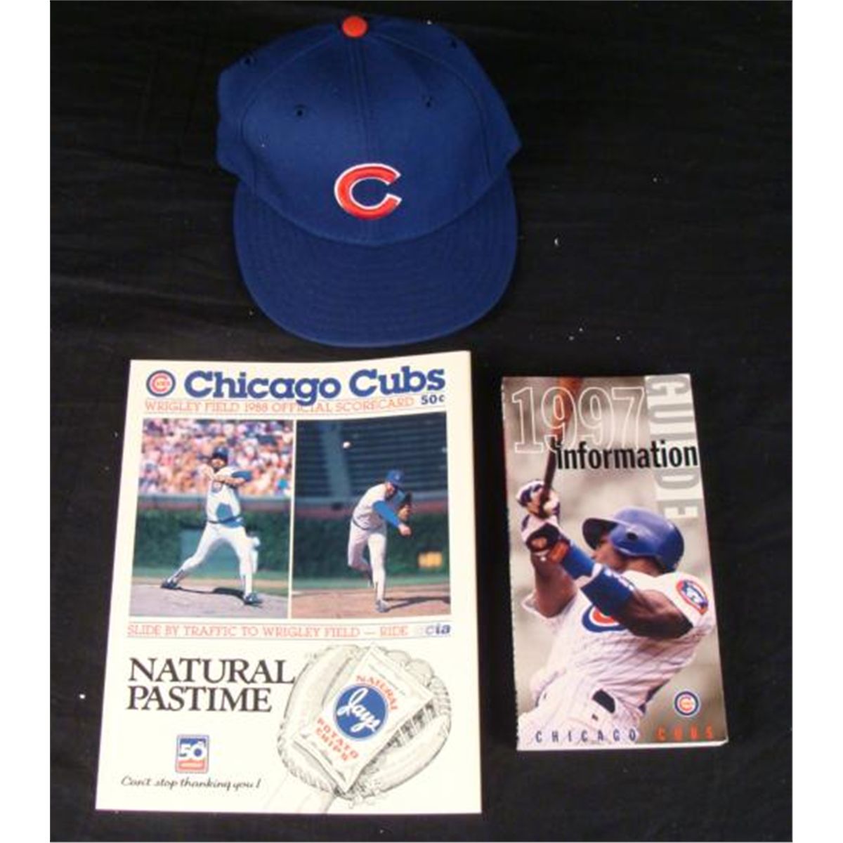 Grab your hands on this vintage 1997 Chicago Cubs Informational Guide. Inside is filled with stats of all your favorite Cubs players, including a brief history of the timeless Wrigley Field. On the cover is Sammy Sosa belting one of his hundreds of homeruns into outer space. The guide is very good condition. Next is a fitted 5950 New Era Chicago Cubs hat. The hat is all blue, fitted, and has the Chicago Cubs logo on the front. The size is 6 3/4 and the hat is in excellent condition. We also offer a 1988 Chicago Cubs Scorecard. Those who are interested in keeping track of an entertaining Cubs game, this scorecard is the perfect way to start; it also includes all of the National and American League pitchers during that year. The scorecard is 8 1/2" x 11" and is in excellent condition in a protective folder. Impress your Cubs friends with this great lot!