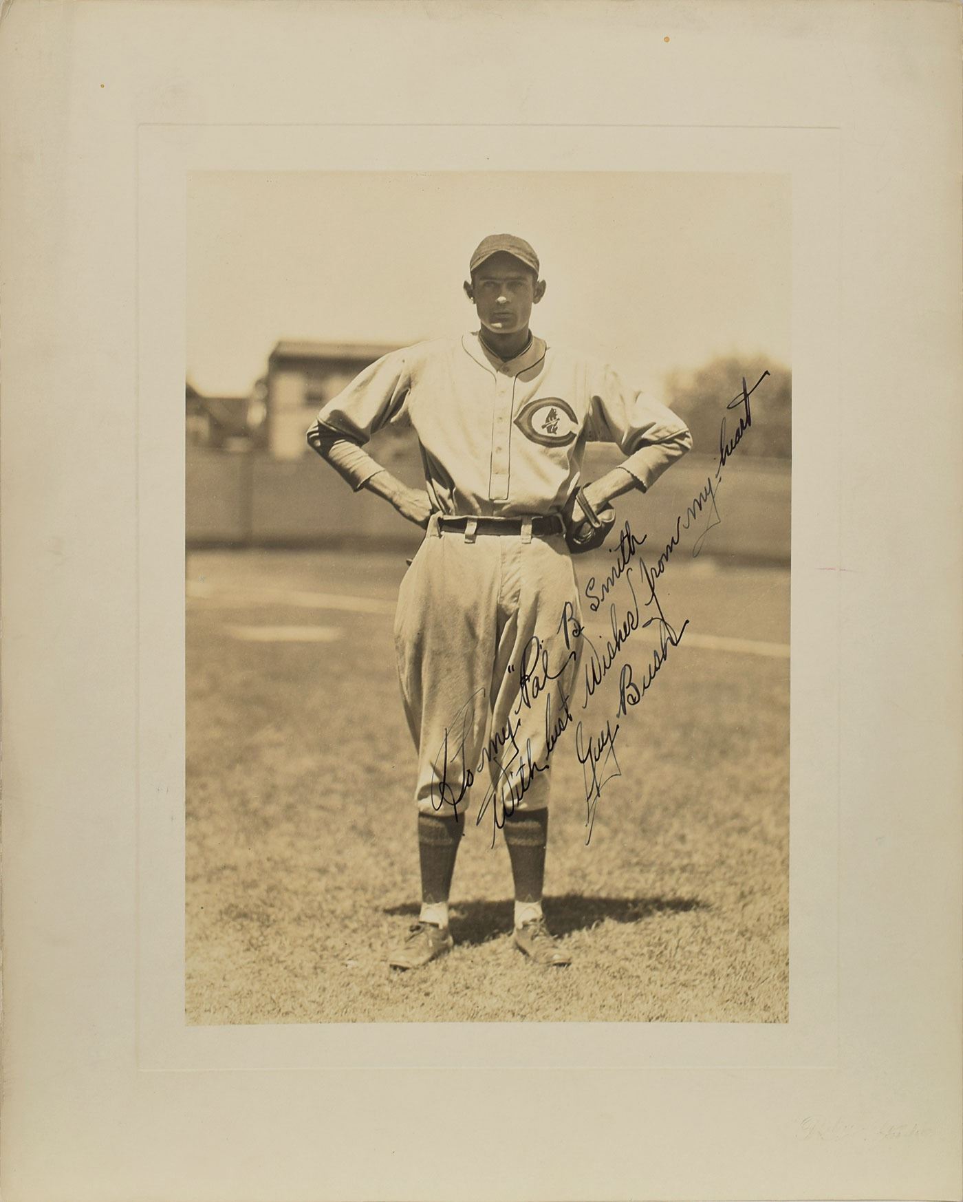 Two exceptional vintage matte-finish 11 x 14 photos by great baseball photographer George C. Burke: one of pitcher Charlie Root at the top step of the dugout, signed and inscribed in fountain pen, "To my pal Bob, Good Luck & Best Wishes, Charlie Root"; and one of pitcher Guy Bush in the field, signed and inscribed in fountain pen, "To my 'Pal' B. Smith, With best wishes from my heart, Guy Bush." Both bear the credit stamp of George C. Burke on the reverse. In overall fine condition. Accompanied by full letters of authenticity from PSA/DNA.