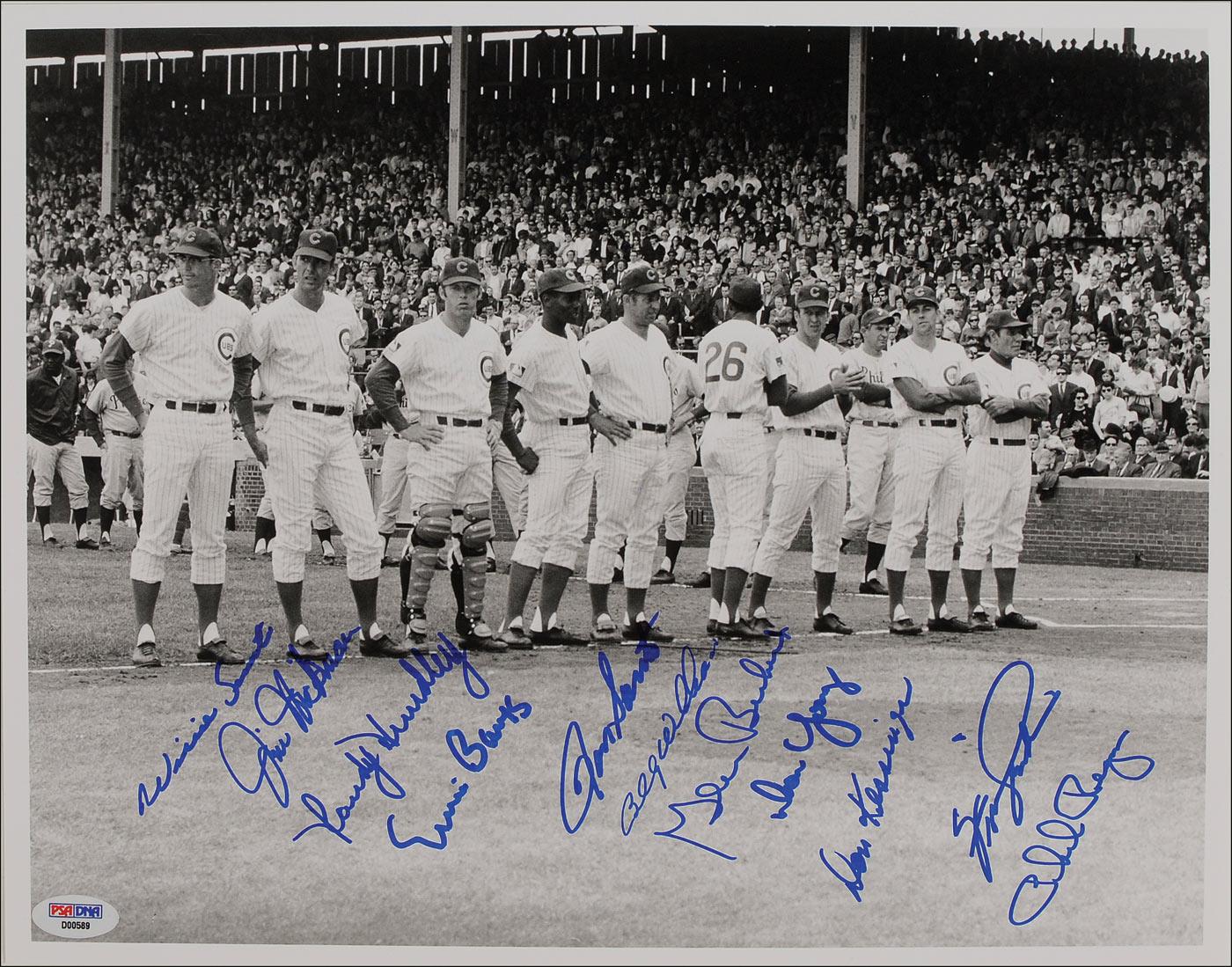 Satin-finish 14 x 11 photo of Leo Durocher and the 1969 Chicago Cubs on opening day, signed in blue felt tip by Ernie Banks, Billy Williams, Fergie Jenkins, Ron Santo, Don Young, Randy Hundley, Don Kessinger, Glenn Beckert, Jim Hickman, Willie Smith, and Phil Regan. In fine condition, with a PSA/DNA authentication label affixed to photo.
