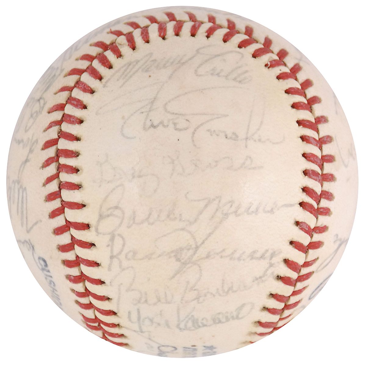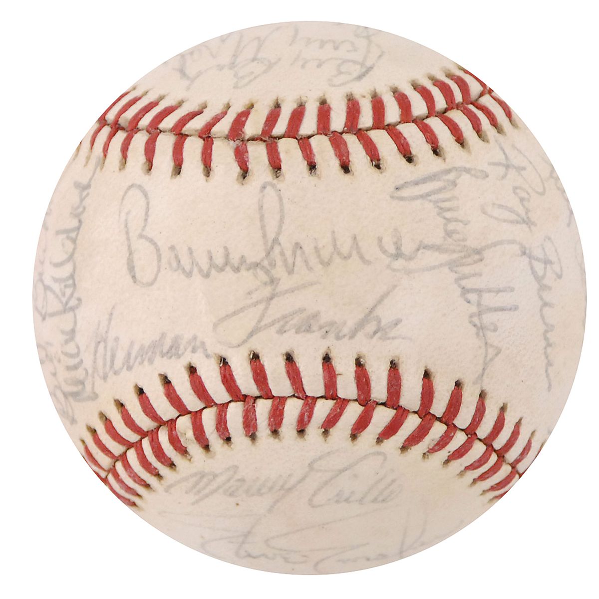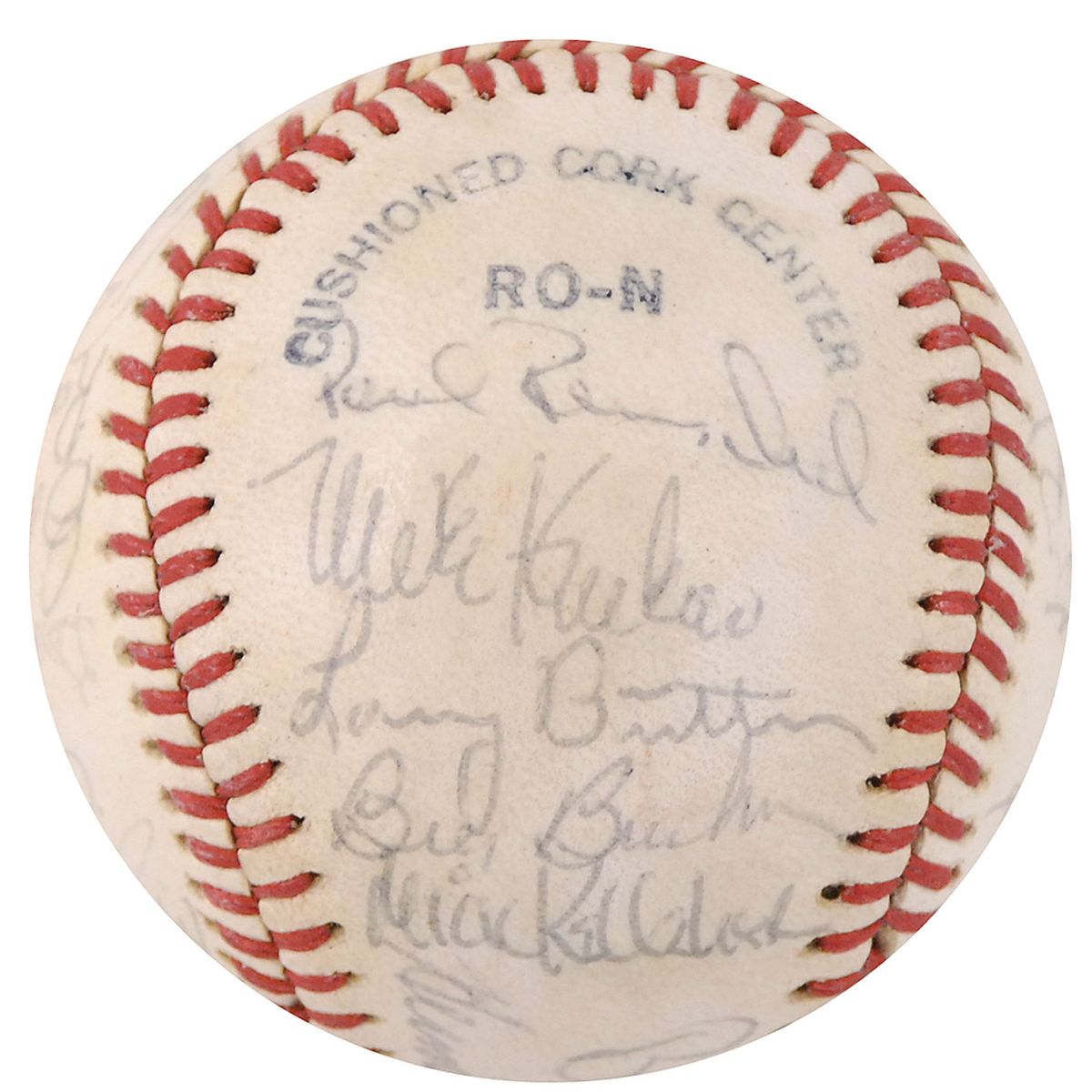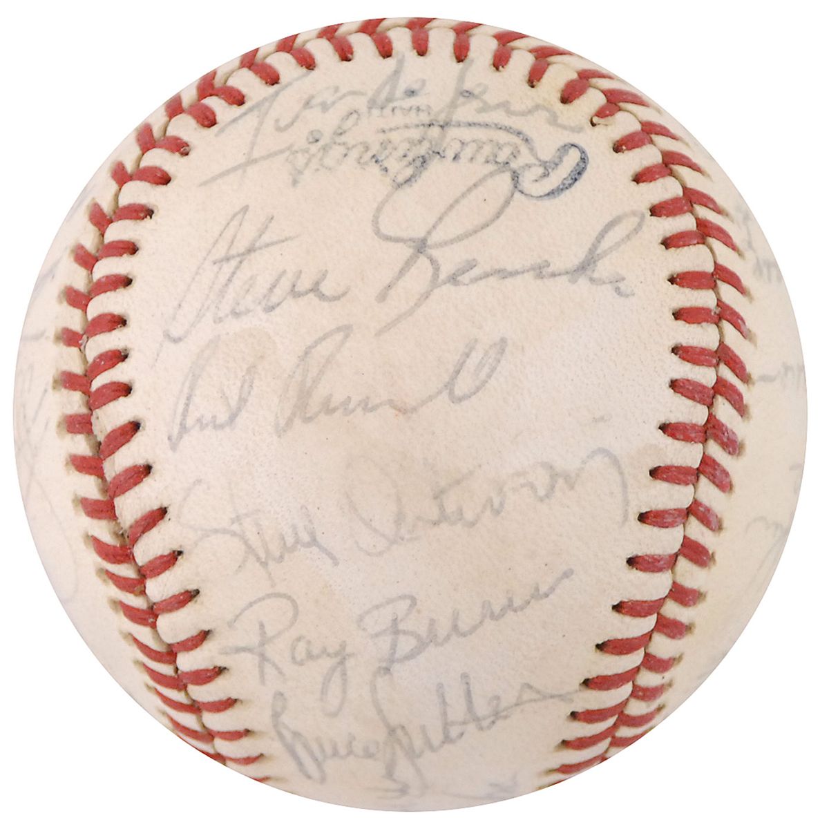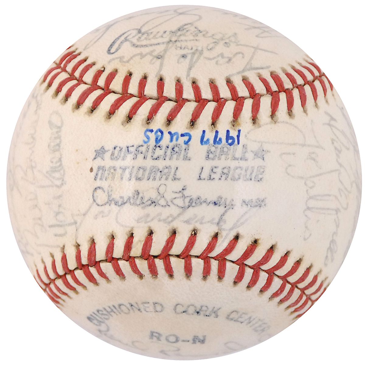 Official Rawlings National League baseball signed in black ballpoint on the sweet spot and side panels by 29 members of the 1977 Cubs team. Signers include: Bruce Sutter, Bill Buckner, Bobby Murcer, Herman Franks, Paul Reuschel, Mike Krukow, Larry Biittner, Mick Kelleher, Steve Renko, Steve Ontiveros, Ray Burris, Manny Trillo, Greg Gross, Bill Bonham, Jose Cardenal, Jim Todd, Gene Clines, Willie Hernandez, George Mitterwald, and Joe Wallis. In fine condition, with an ink identification notation to league stamp, signatures a shade light, and light overall shellac coating.