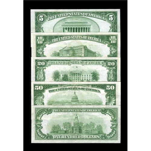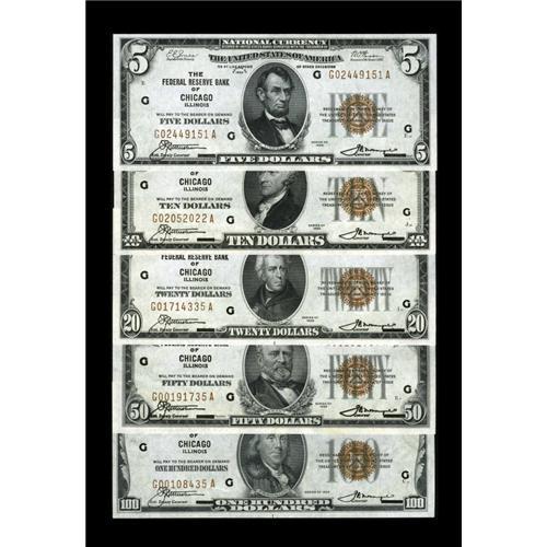 <B>Chicago FRBN Type Collection including</B></I> the $5, $10, $20 grading <B>Gem CU,</B></I> while the $50 grades <B>CU</B></I> with a minor edge tear and a paper clip indentation. The $100 grades <B>CU</B></I> with paper clip indentation.<BR><I>From The Bill and Kathy Stella Currency Collection</B></I><BR><BR><b>Shipping:</b> Coin/Currency (<a target="_blank" href="http://www.heritageauctions.com/common/shipping.php">view shipping information</a>)