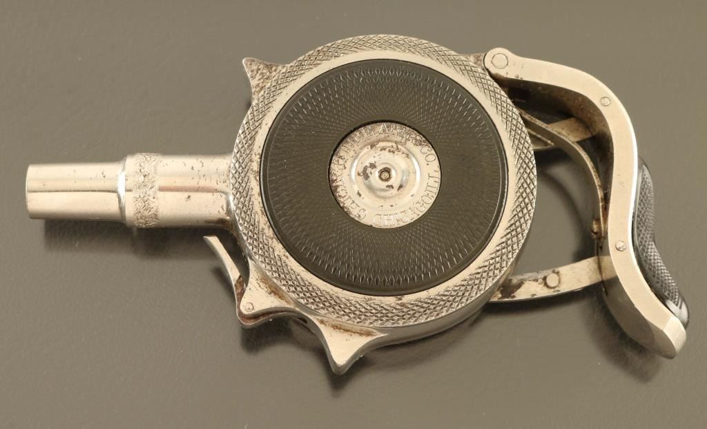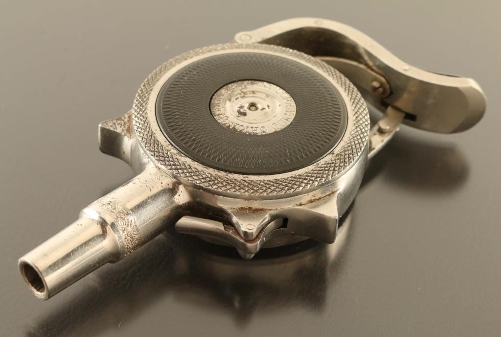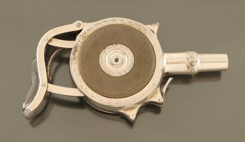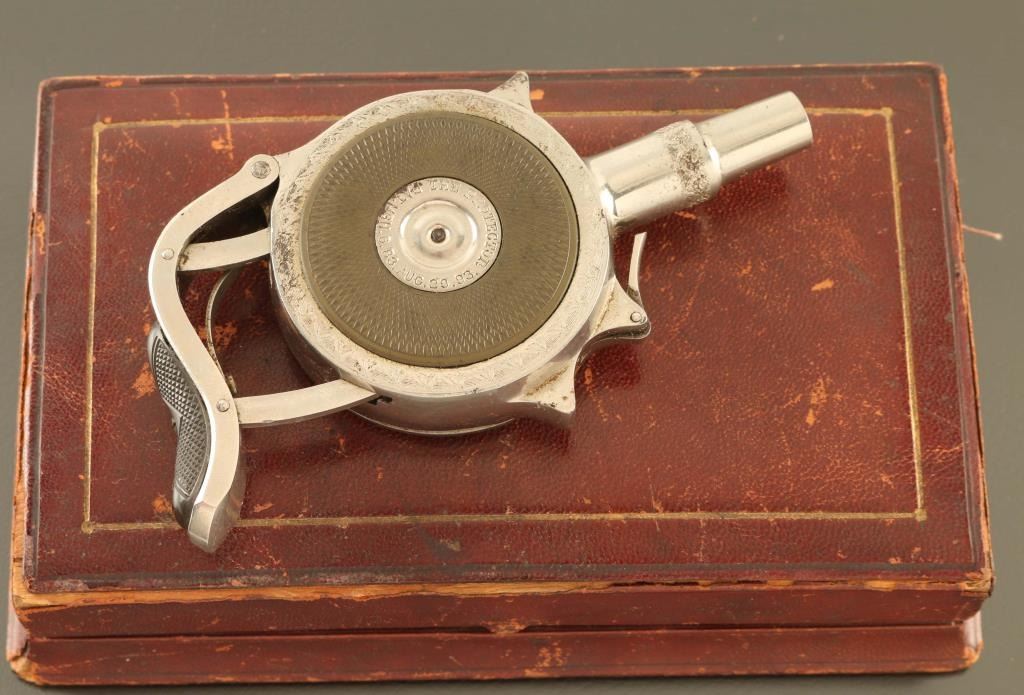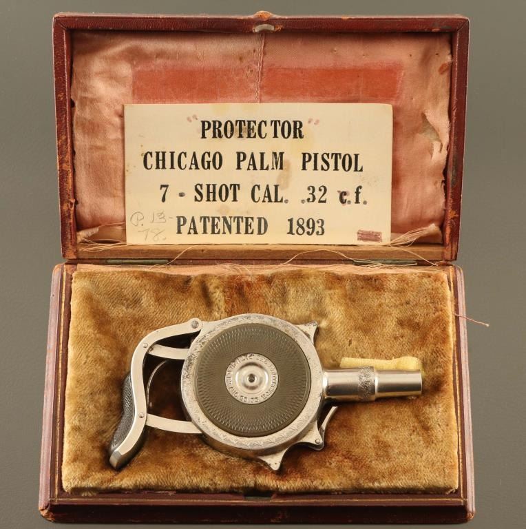 SN: 9389 Cased antique palm squeeze double action turret revolver chambered in .32 Rimfire Short, manufactured in Chicago, IL circa 1890’s. This unique firearm design was originally patented & produced in France by Jacques Edmond Turbiaux, soon after Peter H. Finnegan bought the patent and mass-produced the revolver in America under Chicago Fire Arms Company. Features a nickel plated finish with light coverage floral embellishments, 1 3/4" round barrel, 7 round disc cylinder, grip safety, and smooth black hard rubber side plates. Matching serial numbers are found on the frame, cylinder and side plate. The metal side plate discs are marked "CHICAGO FIRE ARMS CO. CHICAGO, ILL.” & "THE PROTECTOR PAT. MCH. 6.83. AUG. 29.93." Includes a period leather wrapped hinged display case with fitted interior. Revolver retains approximately 95% of its original nickel plated finish showing scattered handling marks and small losses. Action is in need of repair as depressing the palm squeeze trigger does not engage the hammer, the bore is excellent, the markings are clear and the hard rubber sideplates are very good with wear. Condition is near NRA Fine. ***Antique Firearm***