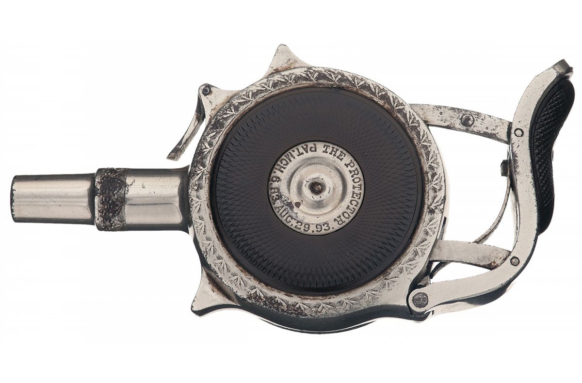 Manufactured in the 1890s these pistols featured a rebated barrel with a band of floral engraving, removable side plate with a checkered pattern around the edge and address markings in a circle inside the checkered rubber panel with the reverse having the floral engraving around the border, marked with the patent dates. The side plate and cylinder are nmismatched. Nickel plated with blue finished side plate. The plunger is fitted with a checkered hard rubber grip.