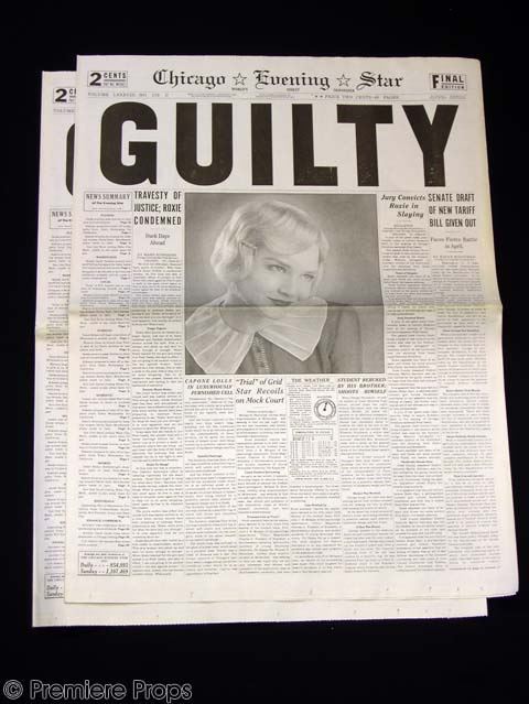 CHICAGO - 2 “Guilty” Newspaper Front Pages - A set of two front pages to a vintage-style edition of the “Chicago Evening Star” newspaper, featuring a large black and white portrait of sweet-looking Roxie Hart (RENÉE ZELLWEGER) under the huge, bold headline exclaiming “GUILTY!” The headline of another article by Mary Sunshine declares the verdict as “Travesty of Justice; Roxie Condemned!” The front pages measures 17” x 11 3/8” each and have been folded and creased through the center. A priceless set of authentic MIRAMAX movie magic with tremendous vintage appeal!!