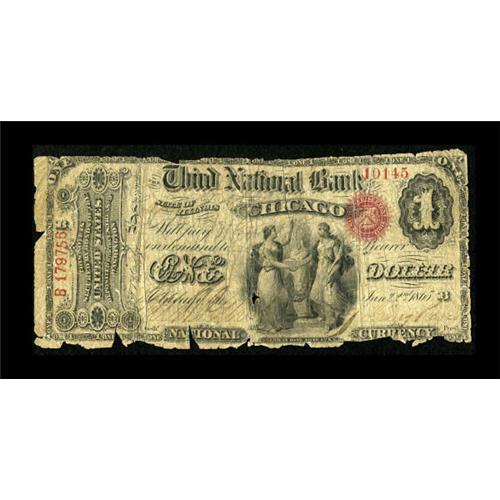 <B>Chicago, IL</B></I> - $1 Original Fr. 380 <B>The Third NB</B></I> Ch. # 236<BR> This institution operated from 1864 to 1877 and issued nearly one and half million dollars in Original Series and Series 1875 notes. A few more than a dozen notes are known to exist, almost all from the Original Series. This Ace has decent eye appeal and is graded <B>Good</B></I> due to the pieces of missing paper noted mostly at the edges.<BR><BR><b>Shipping:</b> Coins & Currency (<a target="_blank" href="http://www.heritageauctions.com/common/shipping.php">view shipping information</a>)