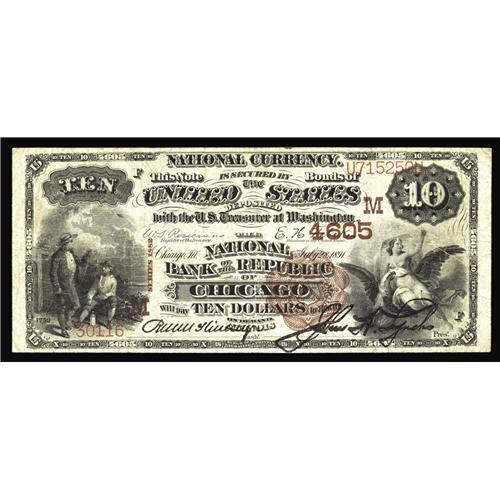 <B>Chicago, IL</B></I> - $10 1882 Brown Back Fr. 485 <B>The NB of the Republic</B></I> Ch. # (M)4605<BR>A <B>Fine+</B></I> example of the $10 Brown Back design. Although this is regarded as an extremely common bank, it should be noted that with this addition to the census, only nine $10 Brown Backs have been documented from here.