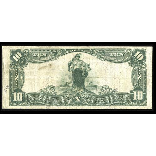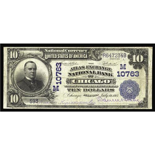 <B>Chicago, IL</B></I> - $10 1902 Plain Back Fr. 606 <B>The Atlas Exchange NB</B></I> Ch. # (M)10763<BR>This Cook County bank was in business for only 15 years prior to failing in 1930 and is quite challenging to locate. This <B>Fine-Very Fine</B></I> example is one of but five $10 Plain Backs documented as surviving from here and still displays the all too often severely faded purple stamped signatures. We expect bidding will reach at least...