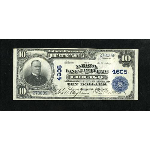 <B>Chicago, IL</B></I> - $10 1902 Plain Back Fr. 628 <B>The NB of the Republic</B></I> Ch. # 4605<BR> A pleasing piece with four folds, three vertical and one horizontal. The overprint is midnight blue. <B>Very Fine.</B></I><BR><BR><b>Shipping:</b> Coins & Currency (<a target="_blank" href="http://www.heritageauctions.com/common/shipping.php">view shipping information</a>)