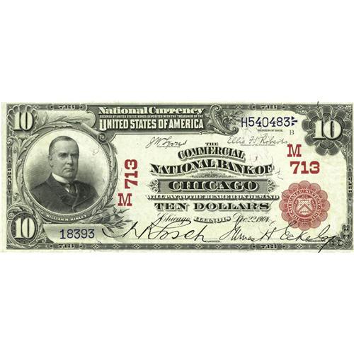 <B>Chicago, IL</B></I> - $10 1902 Red Seal Fr. 613 <B>The Commercial NB</B></I> Ch. # (M)713<BR>This boldly printed Red Seal has been off the market since it last sold in our 1994 Memphis sale. It's a barely circulated piece with great color and body, grading <B>Extremely Fine+</B></I> with just a bit of tight trim on the right side.