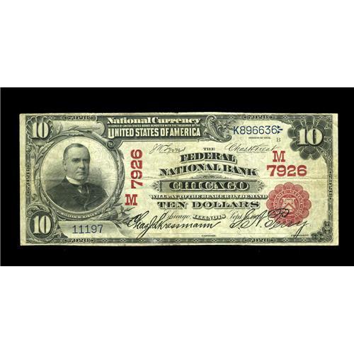 <B>Chicago, IL</B></I> - $10 1902 Red Seal Fr. 614 <B>The Federal NB</B></I> Ch. # (M)7926<BR>A very scarce short lived Chicago bank which issued Red Seals only during its two year tenure. Just eight examples are listed in the census, with this attractive piece new to that compilation. Bright <B>Fine-Very Fine,</B></I> with bold colors and signatures.