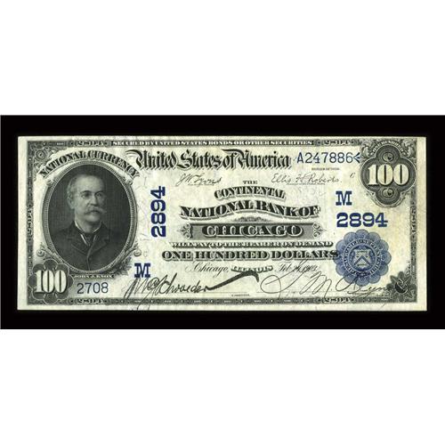 <B>Chicago, IL</B></I> - $100 1902 Date Back Fr. 689 <B>The Continental NB</B></I> Ch. # (M)2894<BR>Just under 100 of this elusive denomination and type are known from the entire state, with this crisp <B>Extremely Fine</B></I> example being the first to surface from here with this, the first title under which it issued this type and denomination. It joins six others listed in the census with the second title. Given the current state of interest in Illinois Nationals, we expect to see tonight's offering sell for about...<BR><I>From The Bill and Kathy Stella Currency Collection</B></I><BR><BR><b>Shipping:</b> Coin/Currency (<a target="_blank" href="http://www.heritageauctions.com/common/shipping.php">view shipping information</a>)