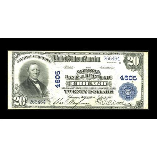 <B>Chicago, IL</B></I> - $20 1902 Plain Back Fr. 654 <B>The NB of the Republic</B></I> Ch. # 4605<BR>This $20 is bright with healthy edges and darkly printed signatures. <B>Very Fine.</B></I>