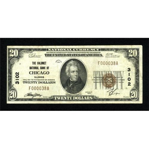 <B>Chicago, IL</B></I> - $20 1929 Ty. 1 <B>The Calumet NB</B></I> Ch. # 3102<BR> An attractive issue from this scarce South Chicago bank. To date, only about a half dozen small size notes are known from this issuer. <B>Very Fine.</B></I><BR><BR><b>Shipping:</b> Coins & Currency (<a target="_blank" href="http://www.heritageauctions.com/common/shipping.php">view shipping information</a>)
