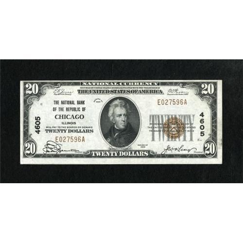 <B>Chicago, IL</B></I> - $20 1929 Ty. 1 <B>The NB of the Republic</B></I> Ch. # 4605<BR> Bright paper and dark inks are located on this note that has a tight top margin. <B>Choice Crisp Uncirculated.</B></I><BR><BR><b>Shipping:</b> Coins & Currency (<a target="_blank" href="http://www.heritageauctions.com/common/shipping.php">view shipping information</a>)