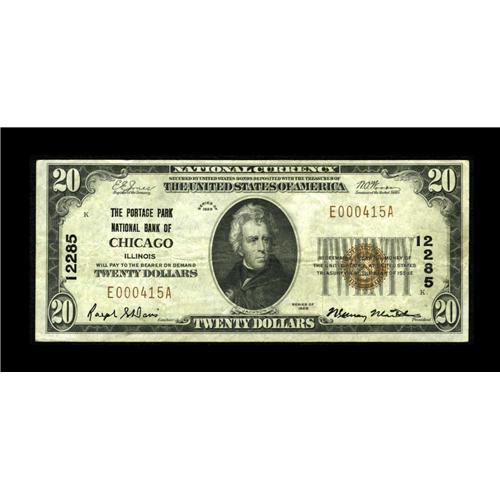<B>Chicago, IL</B></I> - $20 1929 Ty. 1 <B>The Portage Park NB</B></I> Ch. # 12285<BR>This <B>Very Fine</B></I> $20 increases the census total to 11 small. The last auction appearance for a small size on this bank brought almost $400. A small spot is noticed at back center.<BR><BR><b>Shipping:</b> Coin/Currency (<a target="_blank" href="http://www.heritageauctions.com/common/shipping.php">view shipping information</a>)