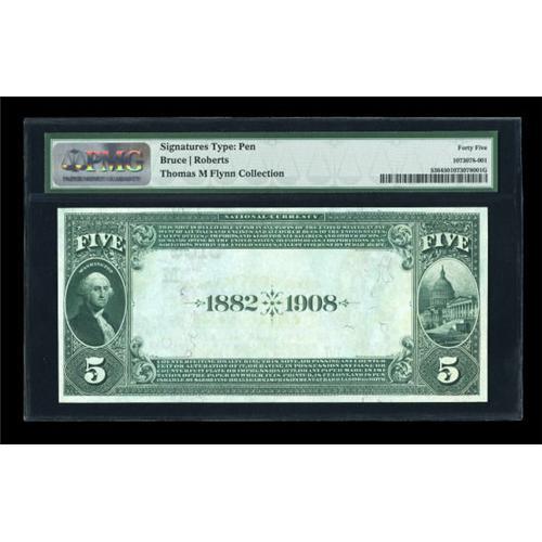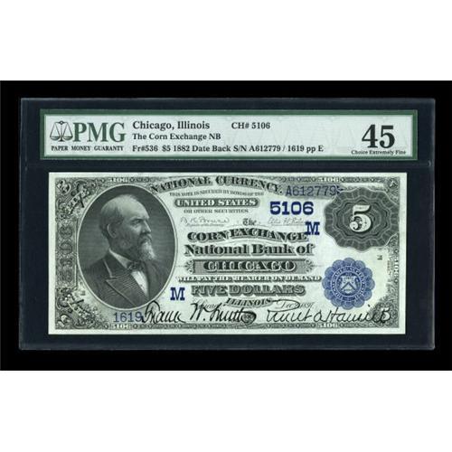 <B>Chicago, IL</B></I> - $5 1882 Date Back Fr. 536 <B>The Corn Exchange NB</B></I> Ch. # (M)5106<BR> A lovely type example with great margins and loads of eye appeal which appears new in the PMG holder. PMG <B>Choice Extremely Fine 45.</B></I><BR><I>From The Thomas M. Flynn Collection</B></I><BR><BR><b>Shipping:</b> Coins & Currency (<a target="_blank" href="http://www.heritageauctions.com/common/shipping.php">view shipping information</a>)