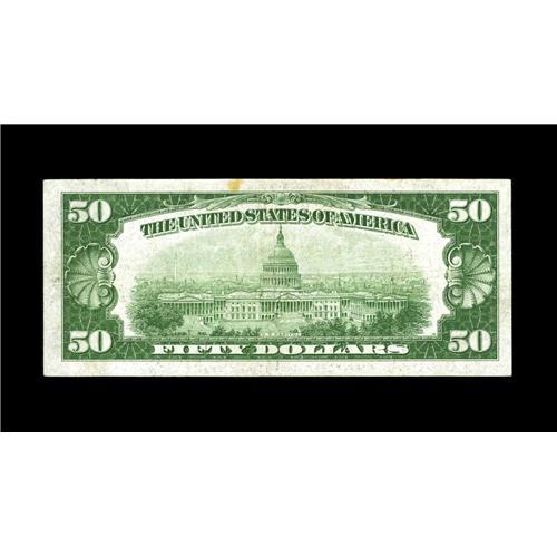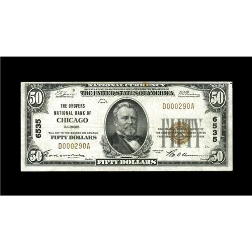 <B>Chicago, IL</B></I> - $50 1929 Ty. 1 <B>The Drovers NB</B></I> Ch. # 6535<BR>More than one hundred small size notes are known, though only about six small size $50's belong to that group. This piece may well be the second finest of that denomination and is moderately circulated with soft paper. A small stain is noted in the top margin. <B>Fine-Very Fine.</B></I><BR><BR><b>Shipping:</b> Coin/Currency (<a target="_blank" href="http://www.heritageauctions.com/common/shipping.php">view shipping information</a>)