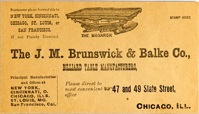 Single light brown colored envelope. Vignette of a decorative pool table at the top center "The Monarch". On the left half are two lists of the companies different manufactures and offices (New York, Cincinnati, Chicago, St. Louis, and San Francisco). Unused with no stamp. In 1845, Moses Brunswick opened his own carriage shop and later expanded it making other items like cabinets, tables, and chairs. He later took the opportunity to grow upon his woodwork and began his sporting-goods market. His works were originally designed for the wealthy as elaborate luxury items. Around 1848 he began to enlarge his market, sending his half-brothers to four other locations to establish sales offices and factories. Then in 1873 Brunswick merged with Balke to form J.M. Brunswick & Balk Co. Then in 1884 Collender merged with them, forming Brunswick-Balke-Collender Co. This corporation became the oldest and largest manufacturer of recreation and leisure-time products in the United States.