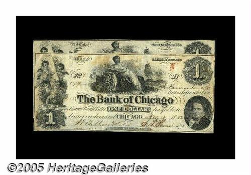<B>Chicago, IL- The Bank of Chicago</B></I> $1 (2) UNL<BR>A pair of $1 notes from the private banking house of Seth Paine, the first dated Nov. 3, 1852 and signed by him as President, the second dated Nov. 1, 1852 and bearing a grey Seth Paine & Co. overprint, this perhaps falsely filled in. Mr. Paine was one of the more colorful characters in Illinois banking. A Socialist and spiritualist, he he hired a medium to contact the spirit of Alexander Hamilton, whose advice he used to direct the policy of his bank. Both notes grade <B>Very Fine</B></I> or so, the first with a few light age spots.