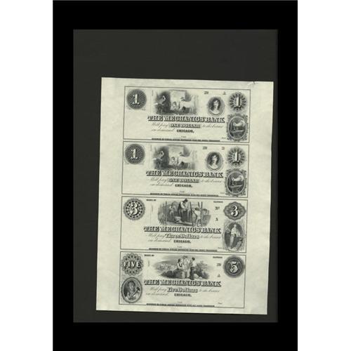 <B>Chicago, IL- Mechanics Bank</B></I> $1-$1-$3-$5 UNL Uncut Sheet<BR>An unlisted bank with each note on the sheet missing the state die. The sheet is likely a later American Bank Note Company product printed on unusually thick white paper. The $5 shows light handling. <B>Choice About Uncirculated.</B></I>
