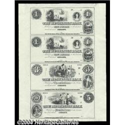 Chicago, IL- The Mechanics Bank $1-$1-$3-$5 UNL Uncut SheetAn unlisted bank with each note on the sheet missing the state die. The sheet is likely a later American Bank Note Company product printed on unusually thick white paper. Uncirculated. <BR><BR><B>Important notice:</B> Heritage usually auctions material at the rate of 200-250 lots per hour. On some occasions eBay Live bid software or the Internet may not be able to keep up with the pace of the auction. We recommend placing a realistic absentee bid now as insurance to avoid disappointment. Occasionally the auctioneer may eliminate or reject an eBay Live bid, and the auctioneer may also reopen a lot after the close of the eBay live bidding (usually because we missed an audience bid), and may reject your bid even if it shows you as the winning bidder. By bidding via eBay Live, you agree that Heritage may award the lot to another bidder at its sole discretion under the circumstances described above or any other reasonable circumstances. Since eBay bids are not shown to us until we open the lot on the floor, we treat those bids just like floor bids. In most cases the floor responds before the eBay bid is presented to us, due to Internet lag time, so for consistency we have made it a policy that floor bids are always considered first over tie eBay live bids. Also please note that all Heritage lots purchased through eBay Live carry a 20% Buyer's Premium. Please make sure you read the Terms and Conditions before you bid. <BR><BR><B>IMPORTANT ANNOUNCEMENT ABOUT RESERVES:</B> Heritage now divulges all reserves on its web site 7 days before every auction. If you want to know whether the reserve on this lot has been met, and if not, what the reserve amount is, please visit this lot page on the HeritageCoin.com web site, or email: bid@HeritageGalleries.com