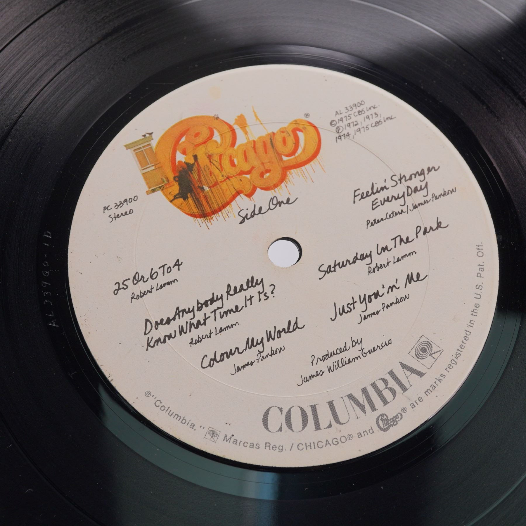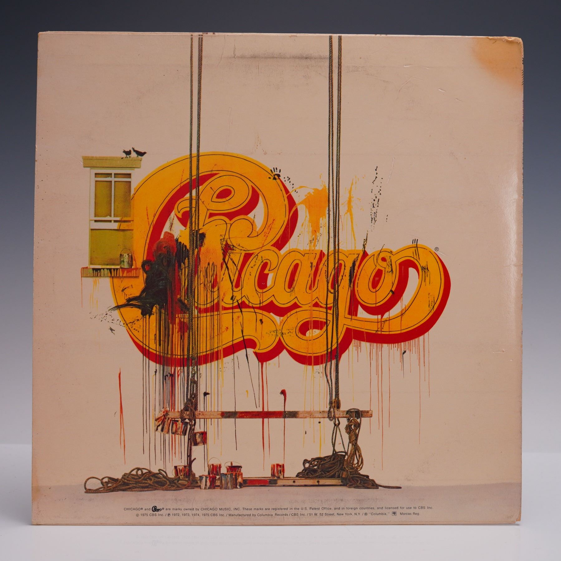 Vintage vinyl record, Chicago IX: Chicago's Greatest Hits, released by Columbia Records. Features classic tracks like 25 or 6 to 4, and Saturday in the Park. Includes original cover art with colorful illustration of the band painting their iconic logo. A must-have for classic rock collectors and fans of 1970s brass-rock fusion.