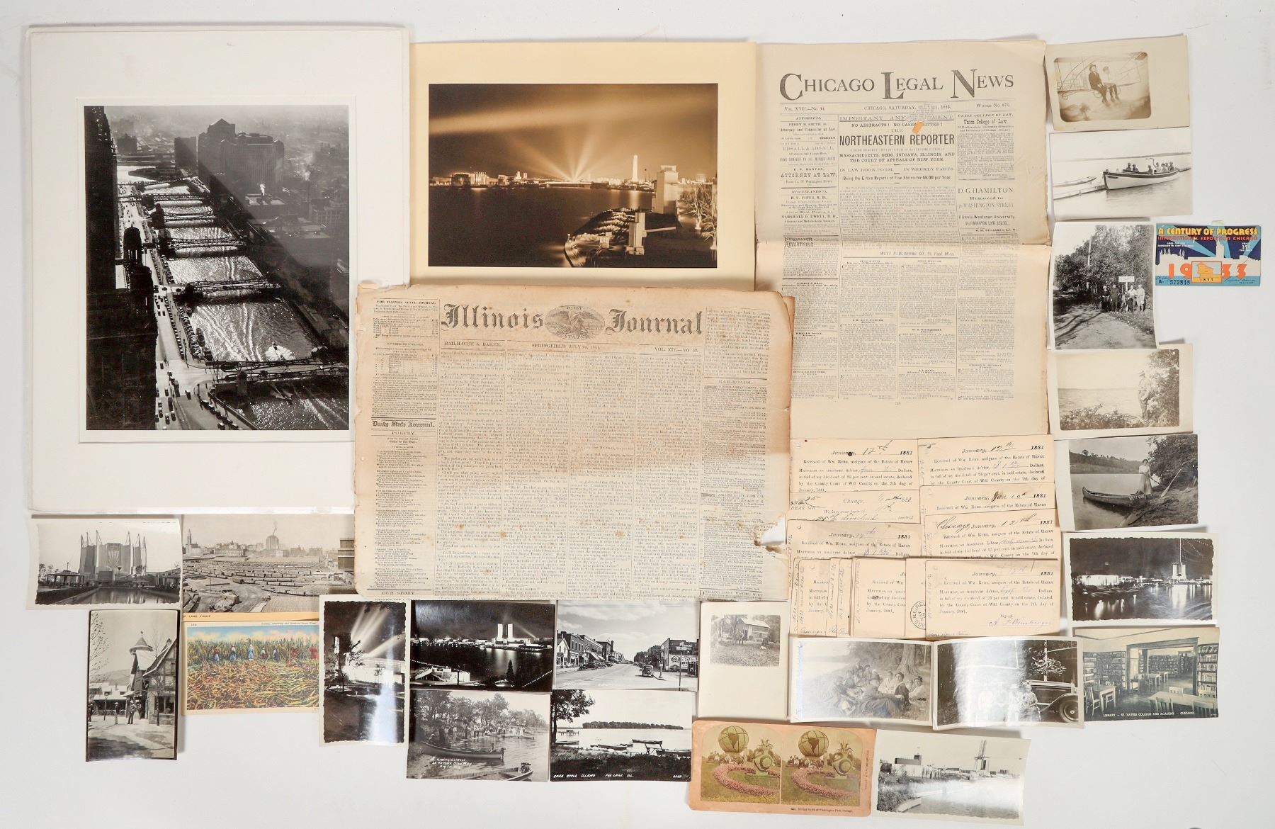 Ephemera group of items from Chicago and the wider Illinois area, including items from several Chicago World's Fairs. Items in the collection date from the 1860s to c. 1940s. Includes 22 photos/photo postcards (including RPCs), 4 non-photo postcards, an admission ticket for the 1933 World's Fair, 21 debtor's cards from Will County, 2 Illinois newspapers (1861 and 1885), and 2 matted photos of Chicago. Varying condition, see photos.