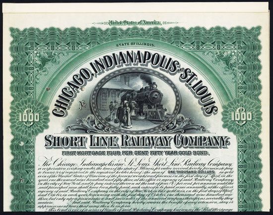 Illinois, 1903, $1000, 1st Mortgage 4% 50 Year Gold Specimen Bond, Black on green border and underprint, Locomotive at station top center with passengers walking along platform, POC's and coupons attached, VF condition, FLABNC. Listed railroad and bond in Cox.