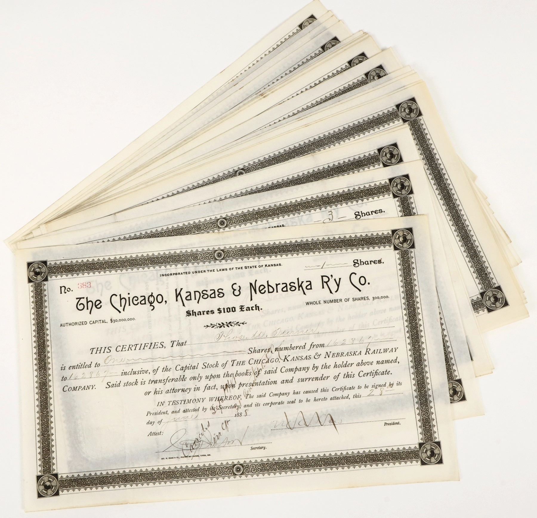 Group of 22 stock certificates from the Chicago, Kansas & Nebraska Railway Company, all dated 188X. Three certificates are issued in 1888 and cancelled using handwritten cancellations, all others are unissued. 12.75"x7.75" certs, unissued pieces in pristine condition, issued pieces with some creasing; see photos.