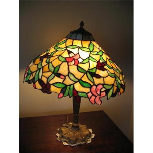 The shade is an overall floral with wonderful multi-colored glass.Characteristics of Chicago Mosaics,the majority of the glass is granite backed so it has a lot of fire when lit! The shade is very well saturated with red,burgundy and pink flowers all around the shade.The vibrant green leaves against the cream and light gold glass make it very attractive.The base is a 2 socket rare 4 dolphin and is original to the shade. Both sockets are in working order.The base compliments the ornate shade perfectly.This is a large,impressive Chicago Mosaic lamp that I have owned for a long time and enjoyed it in my home.