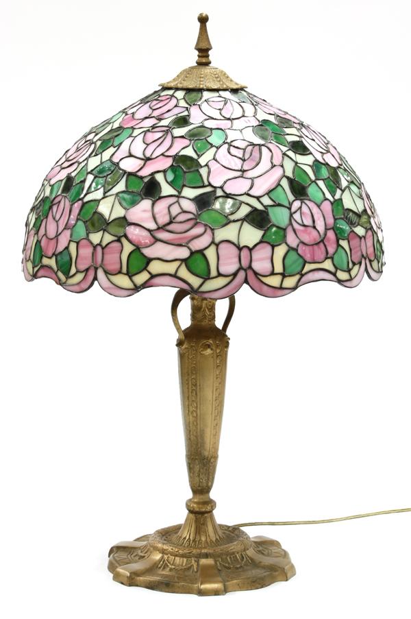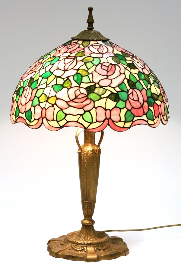 Chicago Mosaic leaded glass table lamp, having a dome form shade decorated with a rose and bow pattern above the two socket cluster and rising on a gilt metal base, marked on base, 24''h x 16''w
