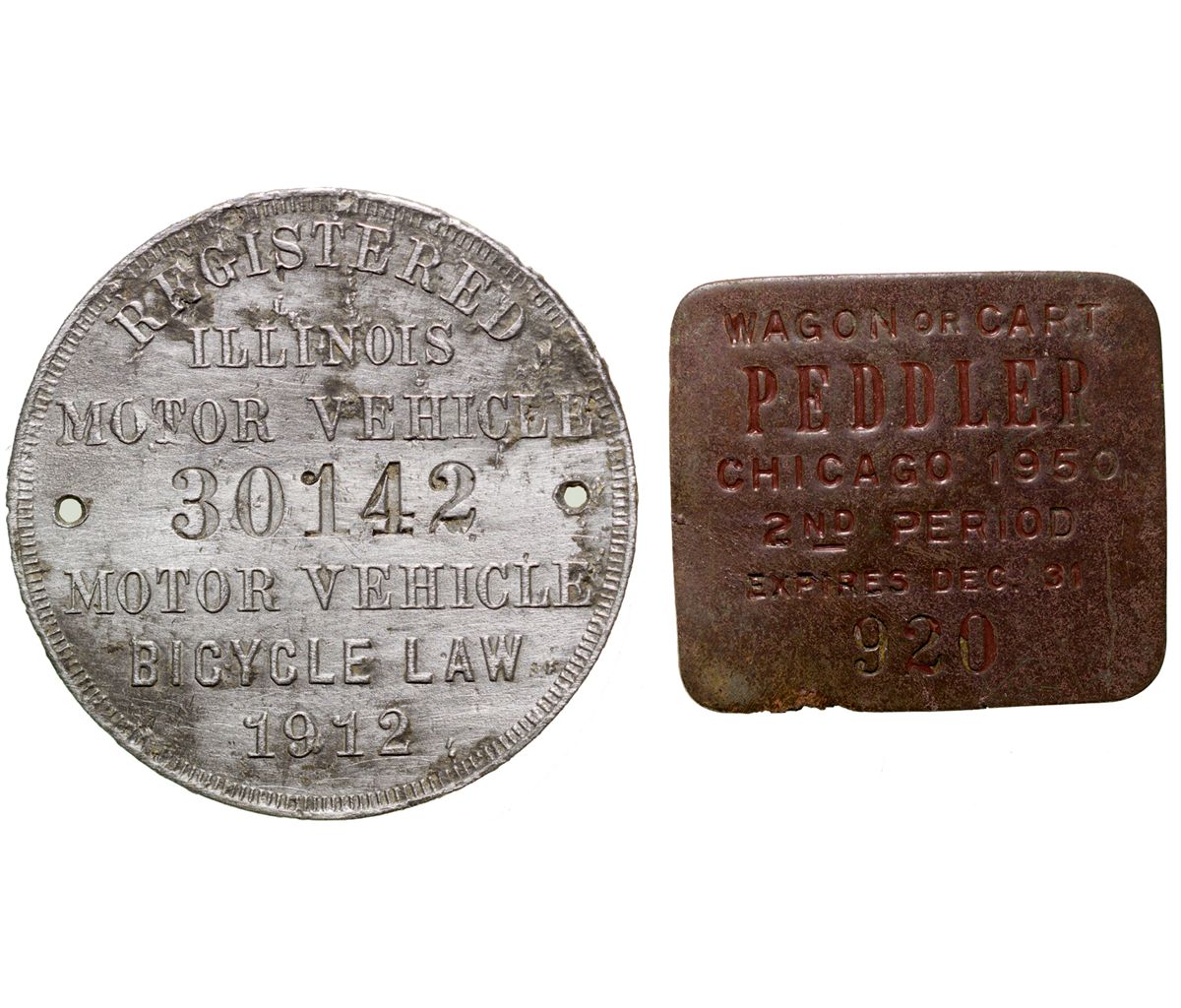 lot of 2: 1) 1912 Registered Illinois Motor Vehicle Bicycle Law aluminum medallion. 2) 1950 Peddler`s Permit, Wagon or Cart. -60793